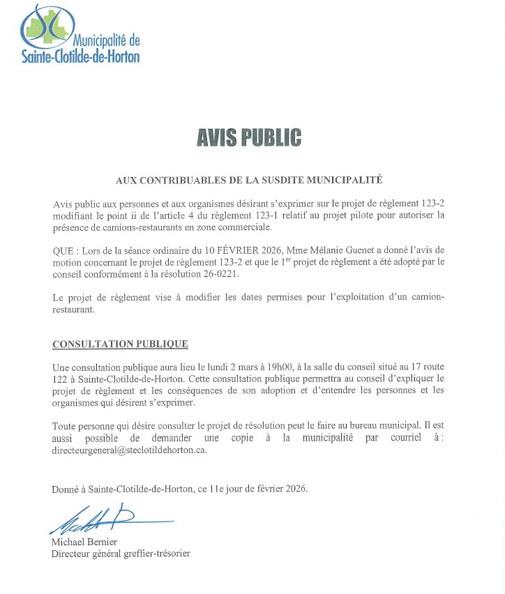 Avis public vente dépôt du rôle d’évaluation foncière de la Municipalité de Sainte-Clotilde-de-Horton 2023-2024-2025