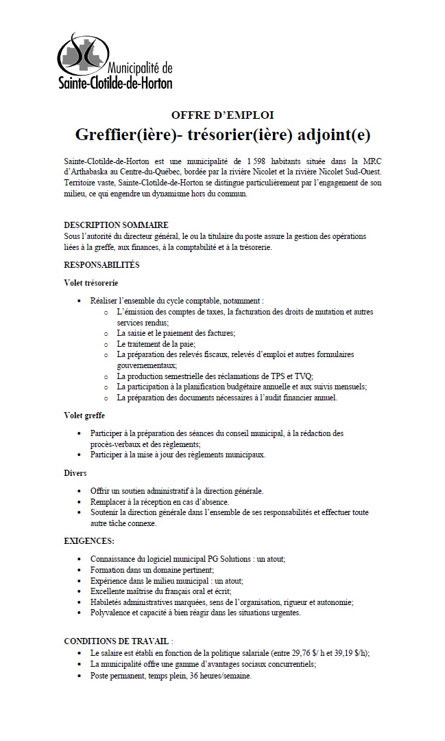 La municipalité de Sainte-Clotilde-de-Horton est toujours à la recherche d’une personne pour pourvoir le poste de greffier(ère)-trésorier(ère) adjoint(e) au sein de son équipe.