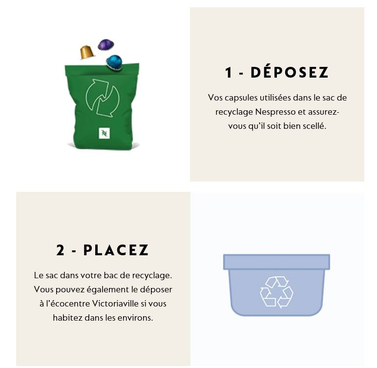 Vous pouvez maintenant recycler vos capsules en aluminium Nespresso utilisées à même votre bac de recyclage en les déposant dans le sac vert qui vous est fourni par Nespresso.